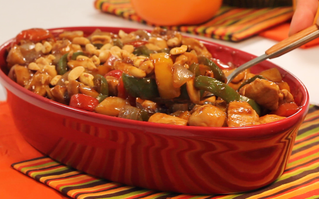 7. Transfira o frango xadrez para uma travessa, polvilhe com amendoim torrado e sirva quente.