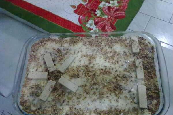 6. Espalhe essa mistura por cima do creme na forma e leve à geladeira até a hora de servir.